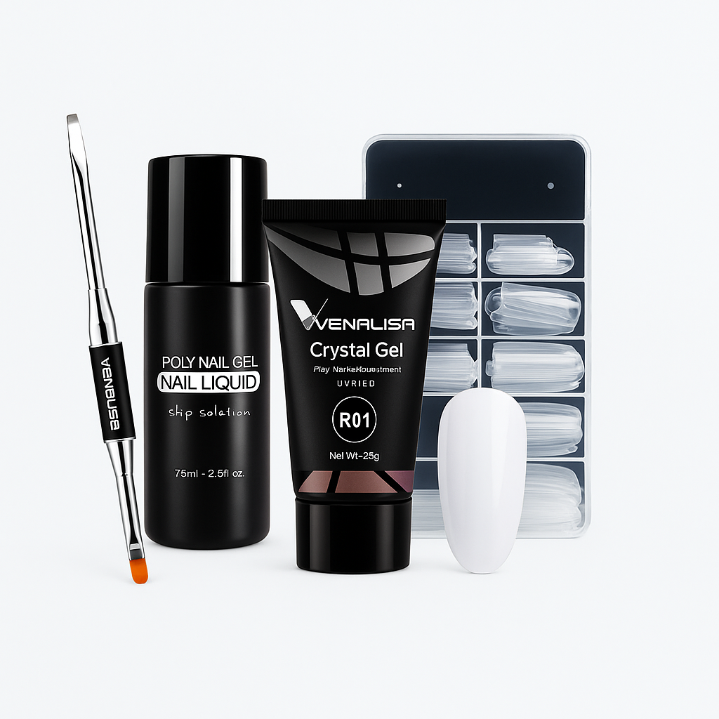 מארז מושלם לבנייה בפוליג’ל הכולל חבילת טיפס 100 יח, מכחול ,פוליג’ל שקוף 30 גרם,נוזל עיצוב ונליסה.