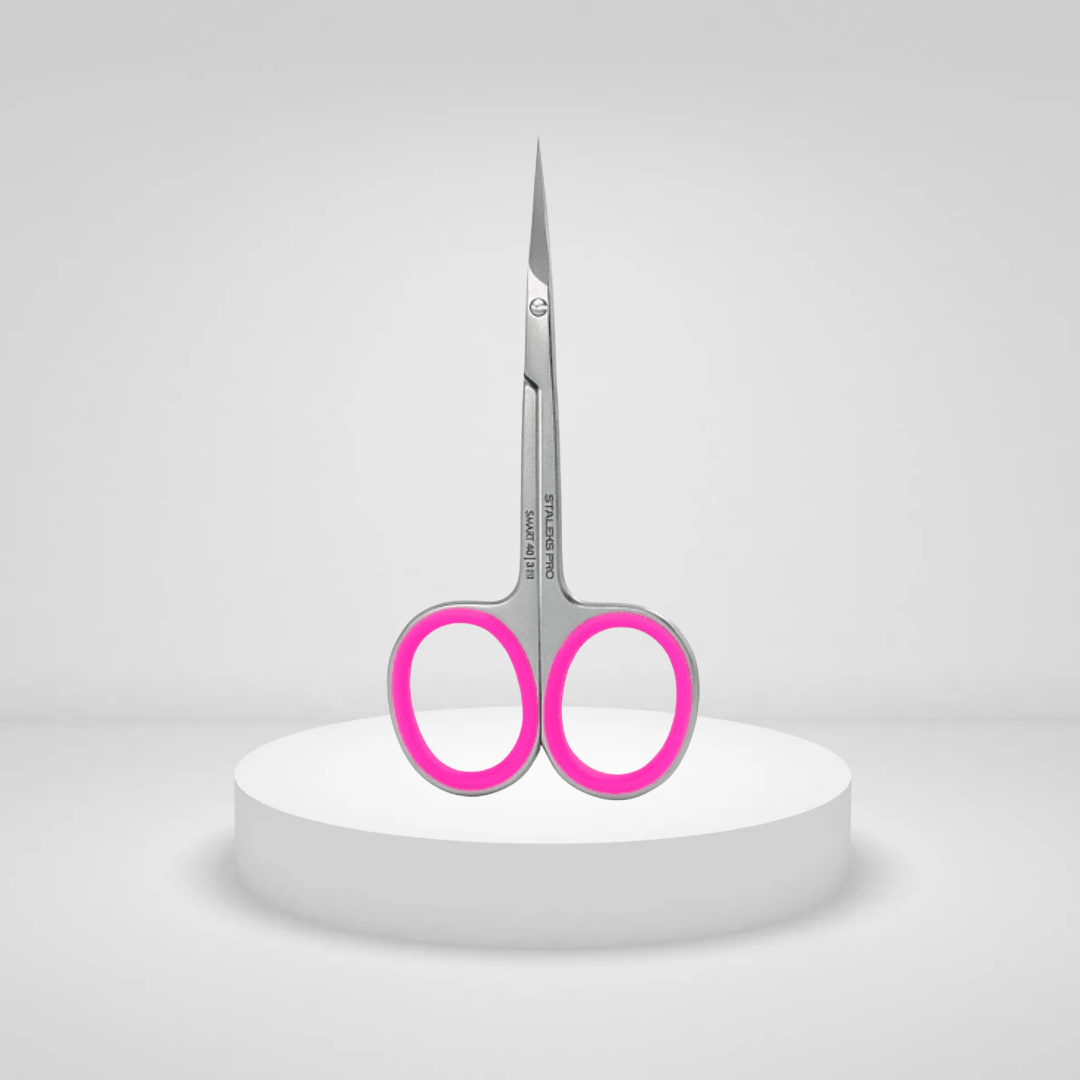 מספריים למניקור עם ריפוד סיליקון ורוד לאחיזה בטוחה מספריים סופר נוחות לגזירת העור במניקור או לגזירת גבות, ידיות מרופדות בסיליקון ורוד, הסיליקון נותן אחיזה נעימה לאצבעות במהלך הגזירה ולמניעת החלקה של המספריים